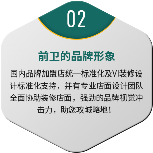 國內(nèi)品牌加盟店統(tǒng)一標(biāo)準(zhǔn)化及VI裝修設(shè)計標(biāo)準(zhǔn)化支持,并有專業(yè)店面設(shè)計團(tuán)隊全面協(xié)助裝修店面,強勁的品牌視覺沖擊力,助您攻城略地!