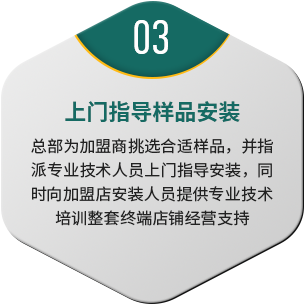總部為加盟商挑選合適樣品,并指派專業(yè)技術(shù)人員上門指導(dǎo)安裝,同時向加盟店安裝人員提供專業(yè)技術(shù)培訓(xùn)整套終端店鋪經(jīng)營支持